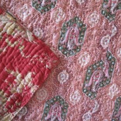 Cwilt brethyn cyfan naill ochr yw hwn, mewn satîn cotwm print coch a phinc, a gwnaed ef ar ddiwedd y 19eg ganrif. Prynwyd ef oddi wrth y teulu o Swydd Gaer a oedd, cyn hynny, wedi gwneud rhodd o saith eitem arall i gasgliad y Gymdeithas, gan gynnwys cwrlidau hecsagonau, cwiltiau appliqué a chwiltiau brethyn cyfan.