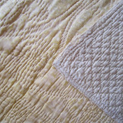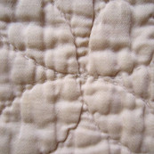 Gwnaed y cwilt hwn tua diwedd yr 20fed Ganrif, a theulu’r wneuthurwraig wnaeth rhodd ohono ar ôl iddi farw. Cotwm lliw hufen yw’r cwilt sgwâr hwn gyda wadin cotwm neu gymysgedd cotwm o bosibl. Cwiltiwyd yr haenau â’i gilydd â llaw gan ddefnyddio edau gotwm hufen ond mae’n amlwg pa ochr y bwriadwyd i fod ar i fyny oherwydd bod clymau ar ben yr edau lle mae’r cwiltiwr wedi dechrau gwnïo i’w gweld yn glir ar y cefn.