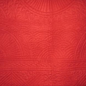 Mae gan y cwilt brethyn cyfan hwn ochr ar i fyny sydd wedi’i gwneud o gotwm coch a chefn mewn twil cotwm hufen. Mae yna haen ychwanegol o ffabrig patrymog coch rhwng yr ochr ar i fyny a’r wadin gwlân. Mae diemwnt wedi’i gwiltio â llaw â chylchoedd o’i fewn yn ffurfio medaliwn yn y canol. O’i amgylch ceir pedwar cebl â hanner cylchoedd sy’n cyd-gloi wedi’u llenwi â chroeslinellu. 1918mm x 1725mm.