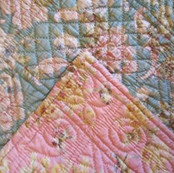 Mae’r cwilt naill-ochr hwn yn cynnwys ffabrigau satîn blodeuog trawiadol mewn pinc a melyn ar y naill ochr, a glas a phinc ar y llall. Mae’n bur debyg mai cwilt priodas ydoedd. Roedd ochrau glas a phinc yn ddewisiadau poblogaidd gan y byddai wedi bod yn bosibl ei droi i’r ochr briodol ar ôl genedigaeth plentyn. Mae ffabrigau o wahanol feintiau wedi’u huno ac yna maen nhw wedi’u pwytho â pheiriant i wneud dwy ochr y gorchudd cwilt. Gwlân oen wedi’i gribo yw’r wadin.
